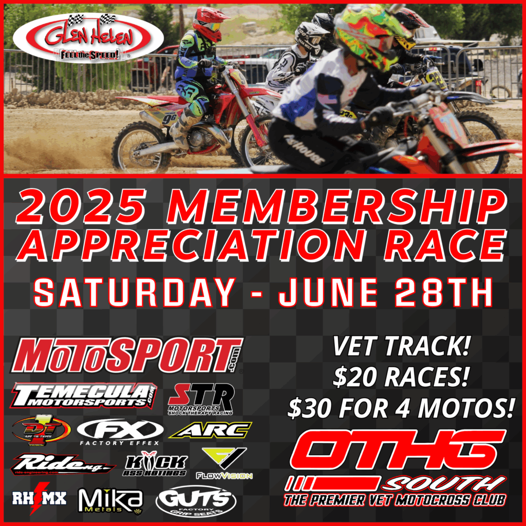 We’re heading back to Glen Helen Raceway one more time before a quick Summer break… This time on the Vet track! It is our Annual Membership Appreciation Race, which means DEEP discounts for race fees and membership applications.