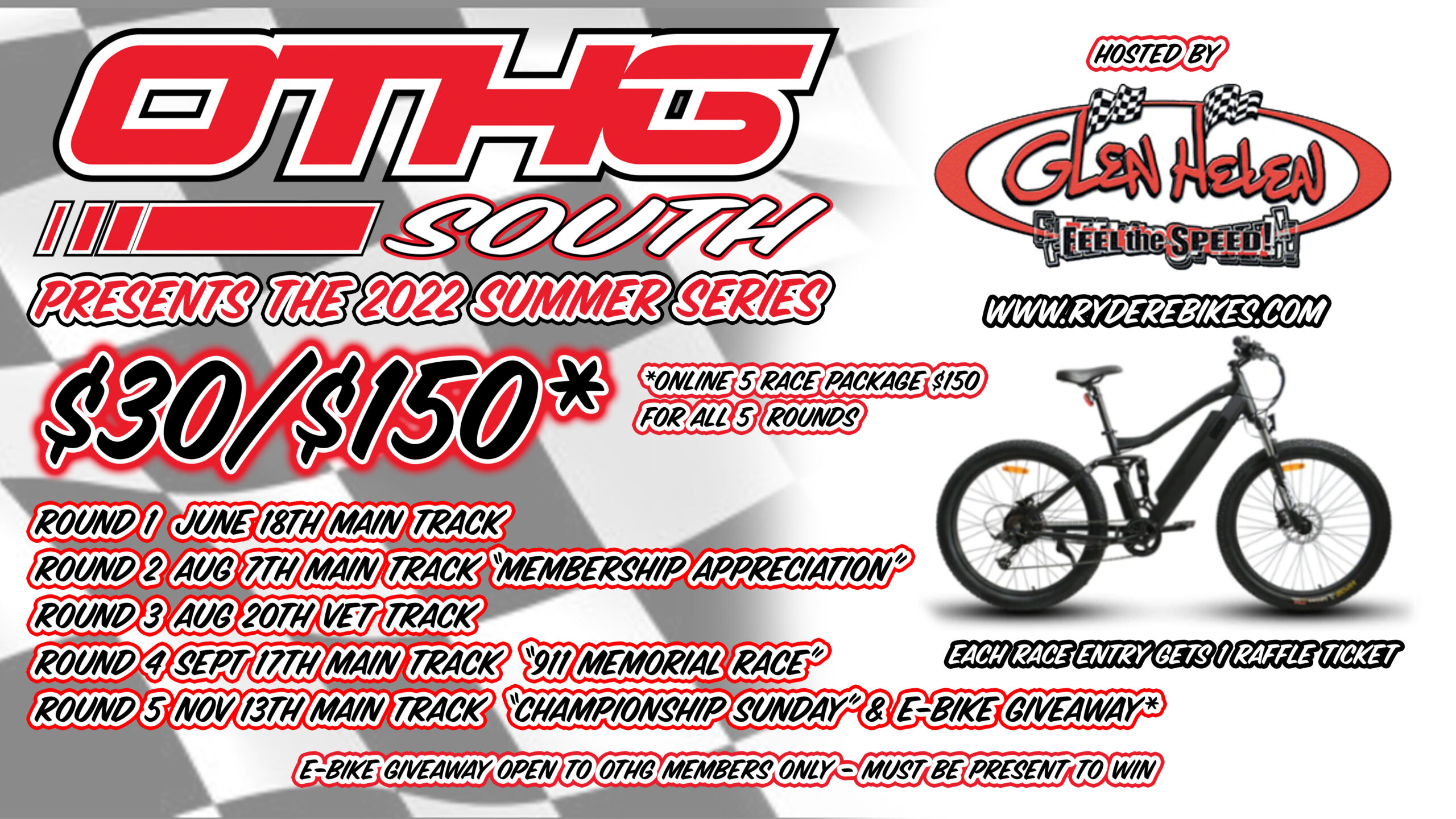 Don’t Forget! Each race entry throughout the Glen Helen Summer Series grants a rider a single raffle ticket for a prize at the last race All tickets will be given out at the last round and go into a pot with one lucky winner walking away with a brand new bike, courtesy of Ryder E Bikes!